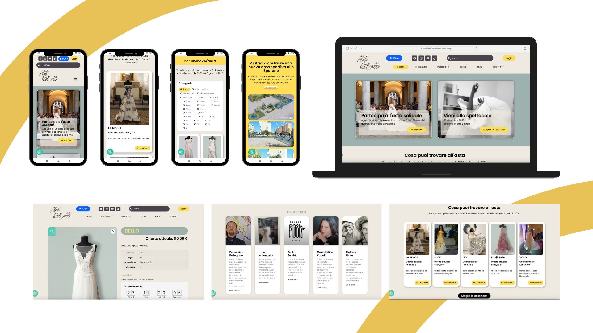 - Sezione asta online integrata, con schede chiare di ciascun abito e pulsanti evidenti “fai un’offerta”, in modo da favorire partecipazione e trasparenza nella raccolta fondi.